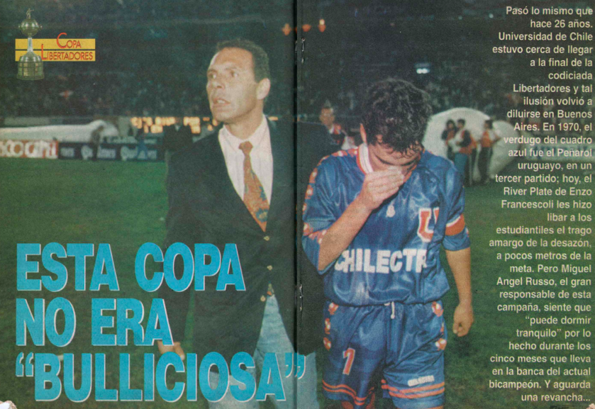 Tras un parón por el inicio de las Eliminatorias rumbo al Mundial de Francia 1998, la ‘U’ enfrentaría la serie de semifinales ante el poderoso River Plate, dirigidos por Ramón Díaz. El 5 de junio, y tras un apoteósico recibimiento al equipo por parte de Los de Abajo, los azules enfrentaban al cuadro millonario con sus mejores jugadores salvo por Rodrigo Goldberg, quien sufrió una lesión en la llave de cuartos de final. Un 2-2 en el partido de ida dejó la llave abierta, pero al no lograr una mínima ventaja provocó que la revancha estuviera cuesta arriba para el cuadro azul. Una semana después, y ante un repleto Estadio Monumental de Buenos Aires, se escribió uno de los capítulos más tristes en la historia de la ‘U’. Derrota por 1-0 y eliminación, la cual estuvo marcada por el alevoso penal no cobrado a favor de los chilenos, tras un golpe de puños del arquero de River, Germán ‘Mono’ Burgos a Esteban Valencia. Posterior al partido, Russo declaró “¿Vos has visto las películas antiguas, esas en las que ya se saben los finales? Eso es lo mismo y ya no nos queda nada por hacer. La falta de Burgos a Valencia sencillamente era penal y expulsión al arquero. Rodas (el árbitro del partido) fue el único que no vio la infracción, porque incluso hinchas de River señalan que eso fue un robo. Ahora me toca perder y punto. Eso si, espero con muchas ansias una revancha”2. 28 años más tarde, y luego de más de 1.000 partidos dirigidos como D.T. en más de 15 clubes diferentes, en entrevista con el programa ‘Líbero” de la cadena argentina TyC Sports, al ser consultado por la derrota que más le dolió en su carrera, Russo señaló que: “…la ‘U’ de Chile en River si me dolió muchísimo porque era mi primera Copa Libertadores, con muy poca experiencia a nivel internacional y llegamos a semis. Teníamos un equipazo bárbaro. Sabíamos que el que pasaba esa fase era el campeón”3.