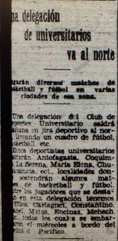 El Mercurio de Santiago informó el lunes 15 de mayo de 1933 que una delegación de universitarios partiría en gira al norte del país el miércoles 17 del mismo mes. En un inicio se informó que la gira correspondía a una delegación del Club Universitario de Deportes a bordo del transatlántico Reina del Pacífico, incluyendo equipos de fútbol y básquetbol, y arribando a ciudades como Coquimbo, La Serena, Antofagasta, María Elena y Chiquicamata.