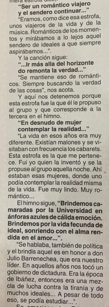 “Íbamos en tercera clase, pero salimos a cubierta a mirar el cielo. Un marino gringo nos mandó para abajo. Le contestamos a garabatos, pero igual nos fuimos. En el camino encontramos un camarote con un piano y no nos dimos cuenta cuando estábamos cantando. Alguien dijo que era una pena que llegáramos al norte sin un himno. Ahí comenzó a salirme la melodía. La letra fue obra de todos, quienes iban incorporando frases, aunque yo me atribuyo la primera, esa de ‘ser un romántico viajero’. No era difícil para mí crear melodías. Lo hacía desde los 14 años” [2].
