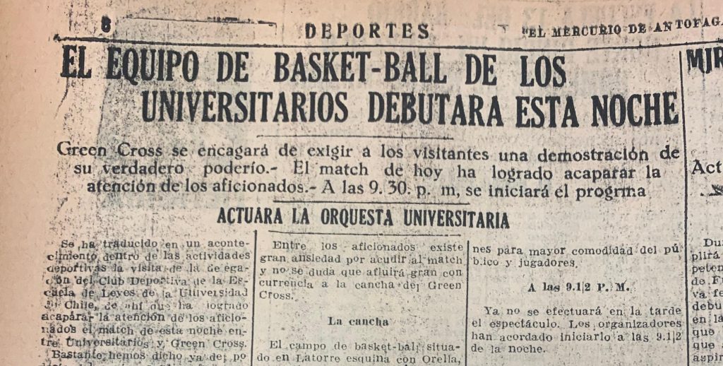 Como se indicó previamente, la gira de 1933 estuvo compuesta por una delegación de la Escuela de Leyes de la Universidad de Chile, quienes viajaron a Antofagasta para competir en básquetbol, tenis, ping-pong, entre otros deportes, a bordo del Reina del Pacífico. Pero en esa delegación no solo participaron deportistas, sino que también músicos universitarios de dos orquestas, una típica y una de jazz, con el fin de amenizar los encuentros deportivos y presentarse ante la concurrencia antofagastina. Su presentación estaba planificada para el domingo 21 de mayo en el debut de los basquetbolistas ante el Green Cross, tal como informaba El Mercurio de Antofagasta: