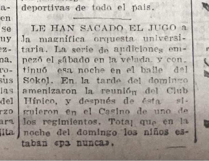 Sin embargo, la primera actuación de la orquesta universitaria no se produjo ese domingo, sino que en la velada del día anterior, primero en el teatro de Chapero Martínez, para luego finalizar en un baile del club Sokol. Para el domingo, la orquesta universitaria tuvo otras dos presentaciones, lo que tuvo como consecuencia que no pudieran amenizar el debut de la Escuela de Leyes ante Green Cross. Así lo relató El Mercurio de Antofagasta: